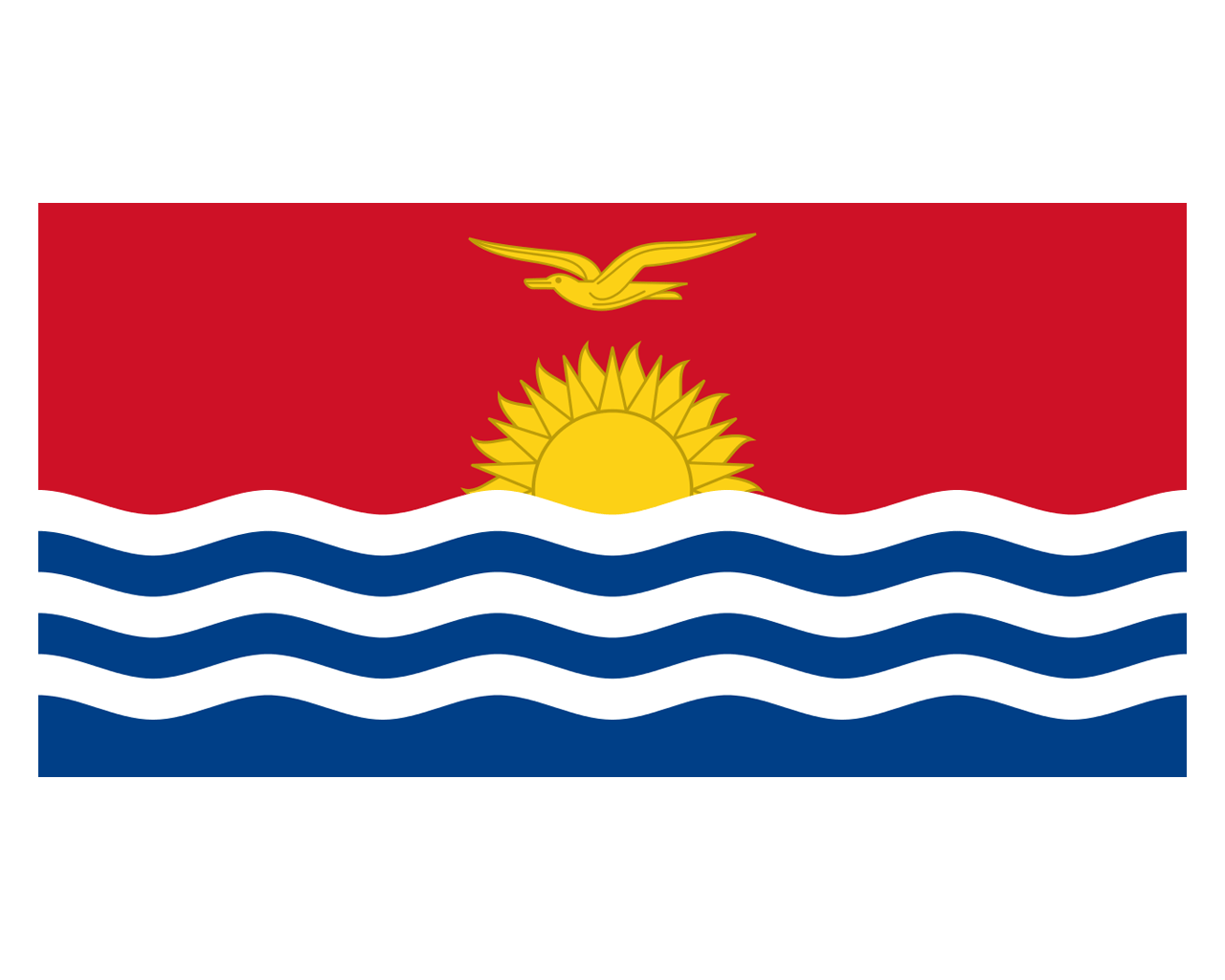 基里巴斯共和國(The Republic of Kiribati),簡稱基里巴斯,太平洋島國,首都塔拉瓦。基里巴斯國旗呈長方形,長與寬之比約為5:3。旗面上半部為紅色,下半部為六道藍、白相間的波紋狀寬帶。紅色部分中間是一輪光芒四射、冉冉升起的太陽,其上方為一只軍艦鳥。紅色象征大地;藍白波紋象征太平洋;太陽象征赤道的陽光,表明該國位于赤道地帶,也象征光明和未來的希望;軍艦鳥象征力量、自由和基里巴斯的文化。