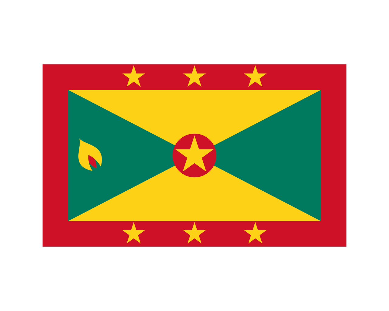 格林納達(Grenada)位于東加勒比海向風群島的最南端,屬于北美洲地區(qū)國家,首都圣喬治。格林納達國旗啟用于1974年2月7日。國旗呈長方形,長與寬之比為5:3,旗面四周為寬度相等的紅色寬邊,上下寬邊中各有三顆黃色五角星;中間由上下兩個黃色三角形,左右兩個綠色三角形組成一個長方形,中央為紅色小圓地,內(nèi)有一顆黃色五角星;左邊的綠色三角形中有一顆肉豆蔻圖案。紅色象征全國人民的友愛精神,綠色象征該島國的農(nóng)業(yè)和豐富的植物資源,黃色象征該國有充足的陽光。七顆五角星代表全國的七個教區(qū),該國居民大多數(shù)信奉天主教;肉豆蔻圖案表示該國的特產(chǎn)。