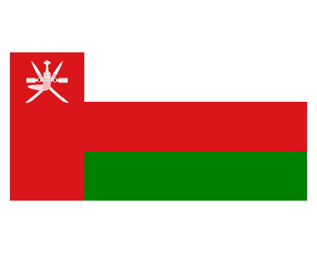 阿曼蘇丹國(Sultanate of Oman),簡稱阿曼,是位于西亞,阿拉伯半島東南沿海的一個國家。阿曼國旗為長方形,長寬之比為2:1。旗面由紅白綠組成。紅色部分在旗面上形成橫的“T”字圖案。旗面的右側上,下分別為白,綠色長方形,中間被紅色寬條隔開。左上方繪有國徽圖案。紅色象征吉祥,白色象征和平與純潔,綠色象征大地。左邊的紅帶上印有國徽。