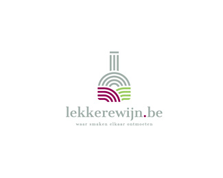 LEKKEREWIJN葡萄酒標志設計,銷售比利時/荷蘭的味道濃郁的葡萄酒。標志象征著一瓶酒瓶,日落和兩排葡萄酒,兩種顏色的運用可以標識葡萄酒行業的特征。