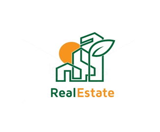 這是一個使用樓房素材的圖標,圖標以簡筆畫的方式構成,線條折疊纏繞,太陽和樹木象征美好環境。