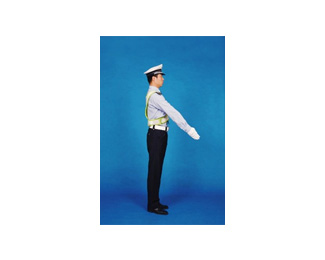 1、面向來車方向,右臂前伸與身體成45度,掌心向左,五指并攏,面部及目光平視前方;