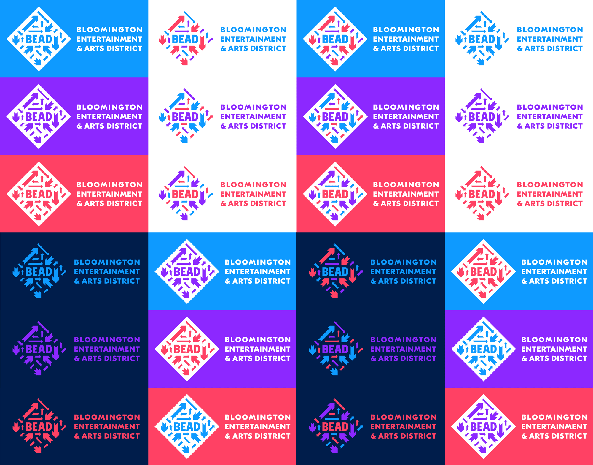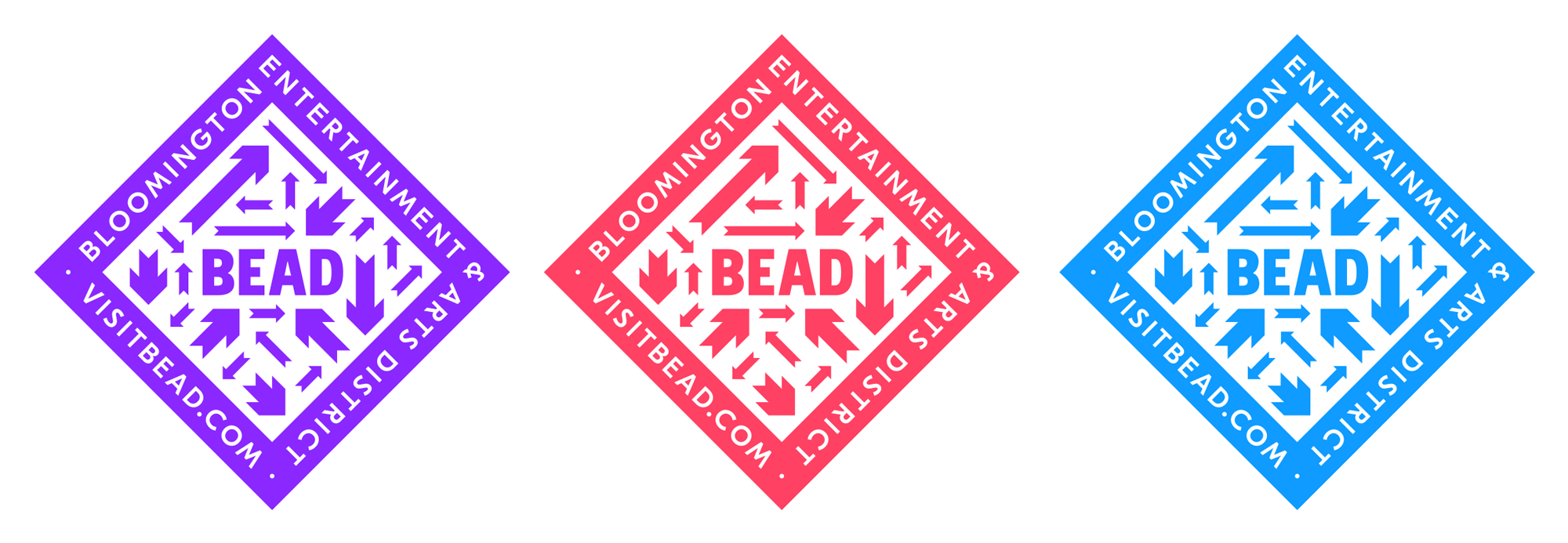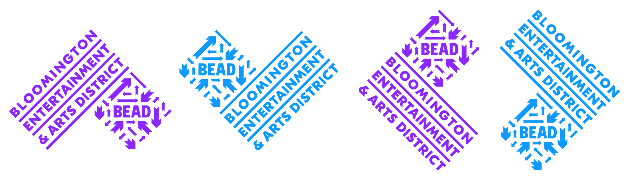 有什么大的地區,它真正居住在城市的中心,所以人們從所有分——北部,南部,東部,西部,和介于兩者之間的,召集在這個相對較小的區域,然后能夠分散在任何方向吃,喝,社交,商店,和/或享受現場表演。人們來自世界各地,一旦來到這里,就可以去任何地方,這種觀念促使我們使用箭頭——很多箭頭——來傳達這個地區的活力。由于珠子是一個城市的布魯明頓倡議,我們發現這是偶然的,城市自己的標志有一些箭頭形狀的開端,只是等待被揭露,所以珠箭頭的結構和比例直接來自城市的標志。我們將箭頭排列成菱形,以暗示區域的邊界,形成類似的形狀。