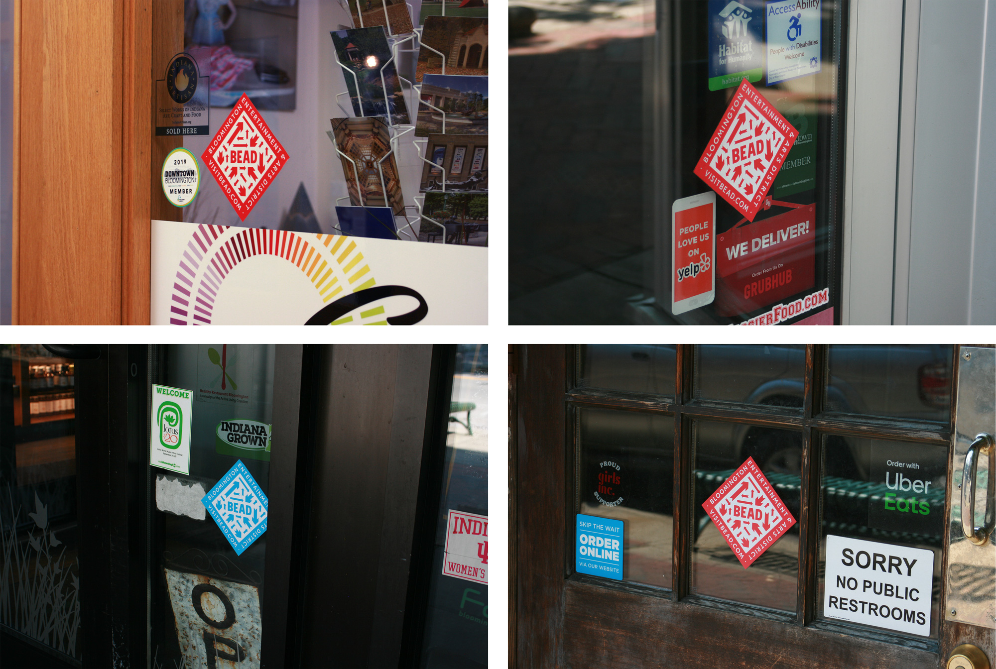 樣本的舊身份?!発dsp”當我們兩年前搬到布盧明頓的時候,市中心有一些分散的橫幅,上面有珠子的標志和信息。這個標識有很多問題,首先是在相對較暗的顏色背景下,很難辨認這些圖標的黑色色調,一旦你這樣做了,你就會意識到它們在執行和信息上是多么的不相關。調色板是有點痛苦和太過時了。標志中的圖標擴展到更大的一組圖標,這些圖標出現在步行地圖上,當時在特定地區存在的業務類型有更清晰的劃分,從那時起,這種劃分就變得更加多樣化。不過,這個標識做得很好,把“珠子”作為一個實體,部分原因是它在標識中的尺寸太大了。珠子的首字母縮寫之所以出現,部分原因是該地區的邊界形成了珠狀的形狀。當這個城市宣布需要報價時,我們抓住機會幫助我們迷人的小鎮改進設計。你的瀏覽器不支持視頻標簽。標志顯示動畫。珠子標志中的箭頭是根據城市標志的形狀設計的。標志。