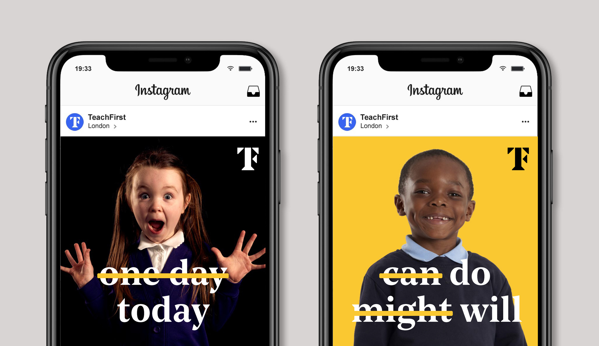 (我們)在英國各地監督拍攝的照片,展現的是被鼓勵做自己的學生——真實的,有時厚臉皮的,但總是人性的——而不是回到已經成為行業標準的老套的課堂照片。我們也拍攝了一組類似風格的老師。Johnson Banks項目頁面攝影手法。設計方法繼續與一個新的印刷語言,強有力的調色板,大膽的圖形風格和修訂的藝術方向的方法。我們還引入了更活潑、更大膽的新語氣。再加上新開發的消息傳遞框架,這鼓勵Teach First在一個越來越多術語的領域使用簡單的通信,少說,而不是多說。Johnson Banks項目頁面社交媒體帖子。“kdsp”的身份圍繞著一些振奮人心的兒童攝影和同樣振奮人心的文案,傳達了該組織的目標,即改變兒童未來的前景從冷漠到樂觀的狀態。從視覺上看,有許多事情正在發生,有些比其他的更好。我喜歡用positiv代替被劃掉的、蹩腳的單詞但我不太喜歡有形狀的剪影照片,也不喜歡襯線和無襯線燈光的組合。但是,作為一個整體,它是一個多用途的、多變的系統。