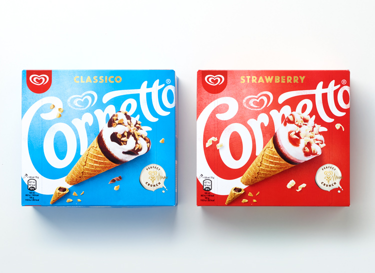 冰淇淋品牌Cornetto新商標設計和包裝設計保持了‘奶油味’和logo的流動性,但使它更簡單,給它一個更年輕,更新鮮的感覺,在包裝上加入了新的自然紋理,為設計增加了更多的真實感。