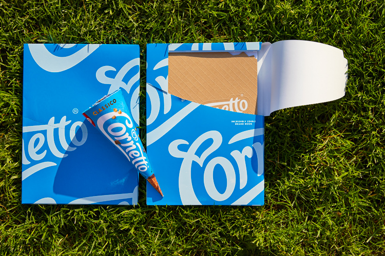 冰淇淋品牌Cornetto新商標設計簡化”現(xiàn)有版本的logo字體,設置為白色。之前的棕色背景被去掉了,字體也被改良,logo現(xiàn)在有了絲網(wǎng)印刷的效果,logo和包裝上出現(xiàn)了褪色的部分。