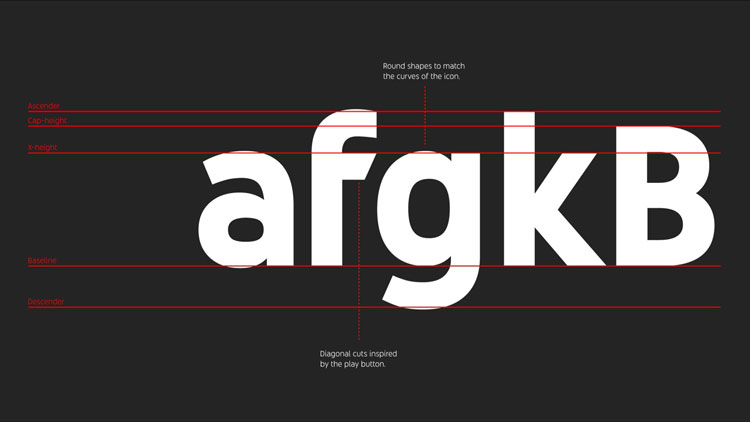 字體的形式受到play按鈕符號的啟發,一些字母上的圓形邊緣是基于彎曲的紅色外方框,對角線上的切割反映了中間的白色三角形。